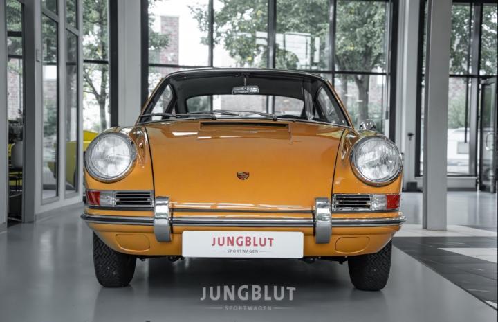 Porsche 911 Coupé („Ur-911“), gebaut am 10.10.1966 (mit grünen Ziffern), zugelassen am 26.05.1967, 2,0 l, 96 kW/130 PS, in der Originalfarbe Bahamagelb, mit 5-Gang-Getriebe, verchromten Lochscheibenrädern, Radio und Pepita-Sitzen.